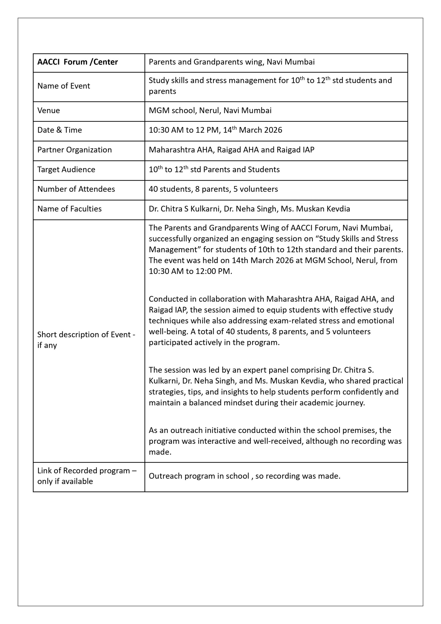 Study Skills and Stress Management for 10th–12th Standard Students and Parents [14 March 2026] Study Skills and Stress Management for 10th–12th Standard Students and Parents [14 March 2026] Leave a Comment / AACCI ASSOCIATED ACTIVITIES, AACCI COLLABORATED ACTIVITIES, RECENT EVENTS CLICK HERE: Study Skills and Stress Management for 10th–12th Standard Students and Parents [14 March 2026] PDF